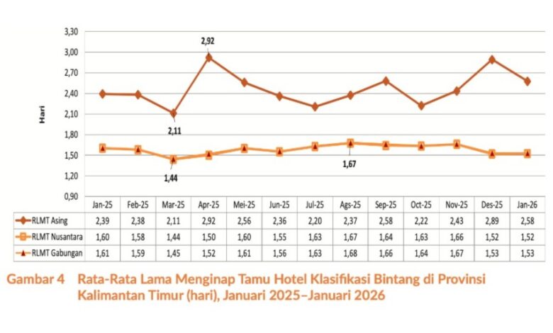BPS juga mencatat selama periode Januari 2025 hingga Januari 2026, rata-rata lama menginap tertinggi tamu nusantara di hotel berbintang terjadi pada Agustus 2025 dengan angka 1,67 hari. Data tersebut menunjukkan tingkat hunian hotel di Kalimantan Timur masih mengalami fluktuasi, terutama setelah berakhirnya periode libur panjang akhir tahun.